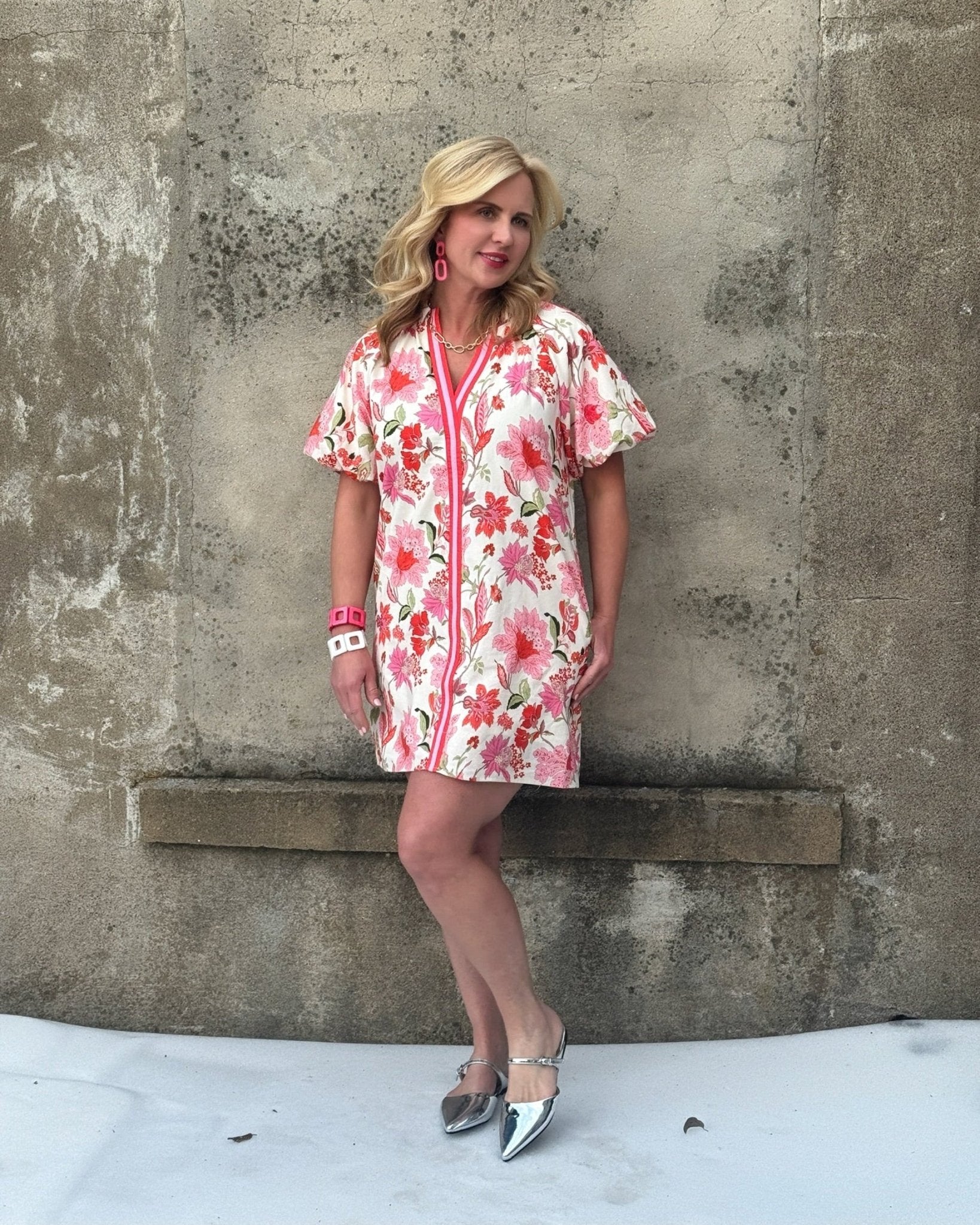 Floral Balloon Sleeve Mini Dress - Vibrant Pink & Coral