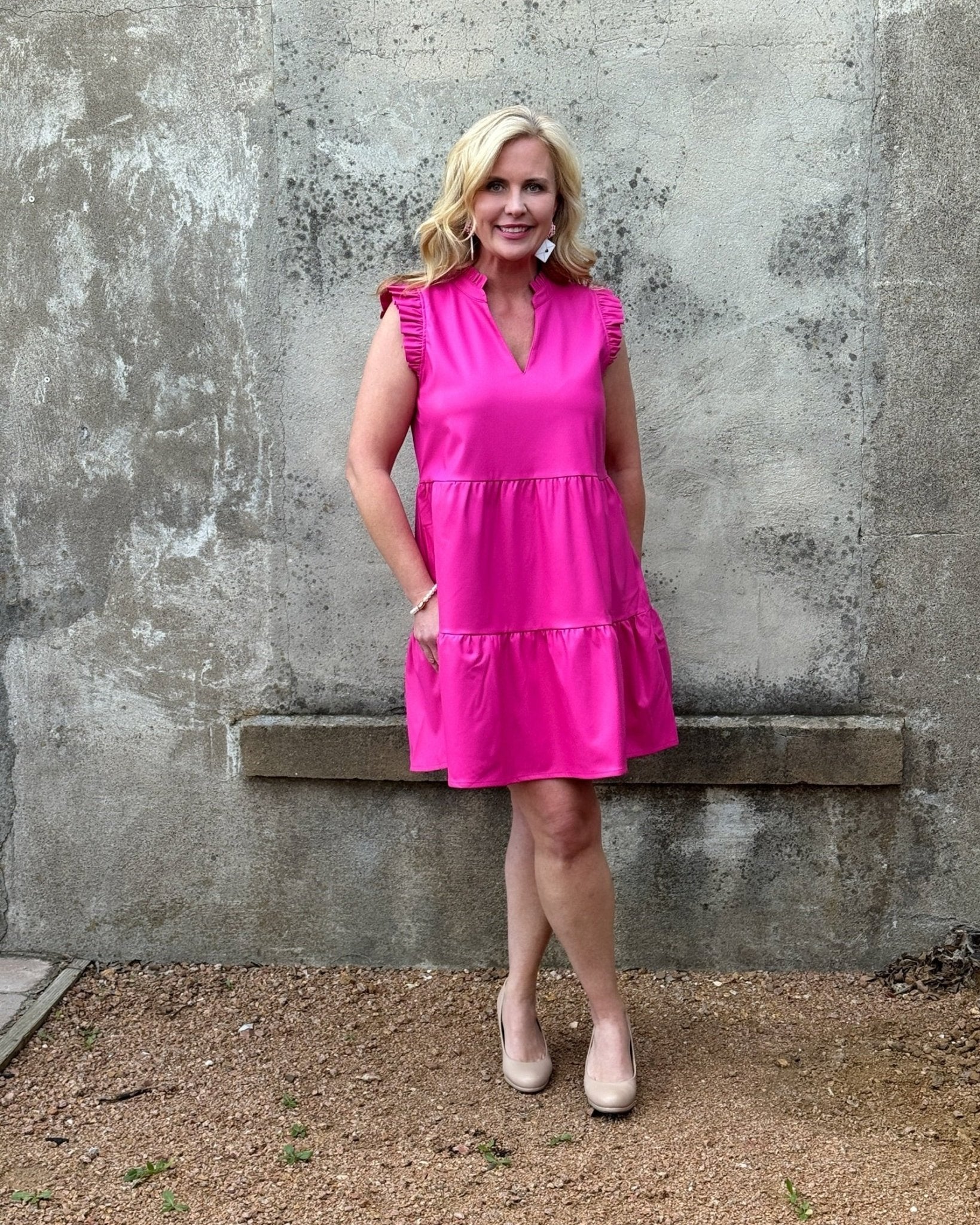 This eye-catching dress features a brilliant fuchsia hue.   Its charming tiered silhouette creates a flattering effect, ensuring a comfortable yet chic fit that flows beautifully with every step. Crafted for both style and ease, this dress has a ruffle cap sleeve and a sophisticated V-neckline with a subtle stand collar, adding unique details that elevate its overall appeal.
