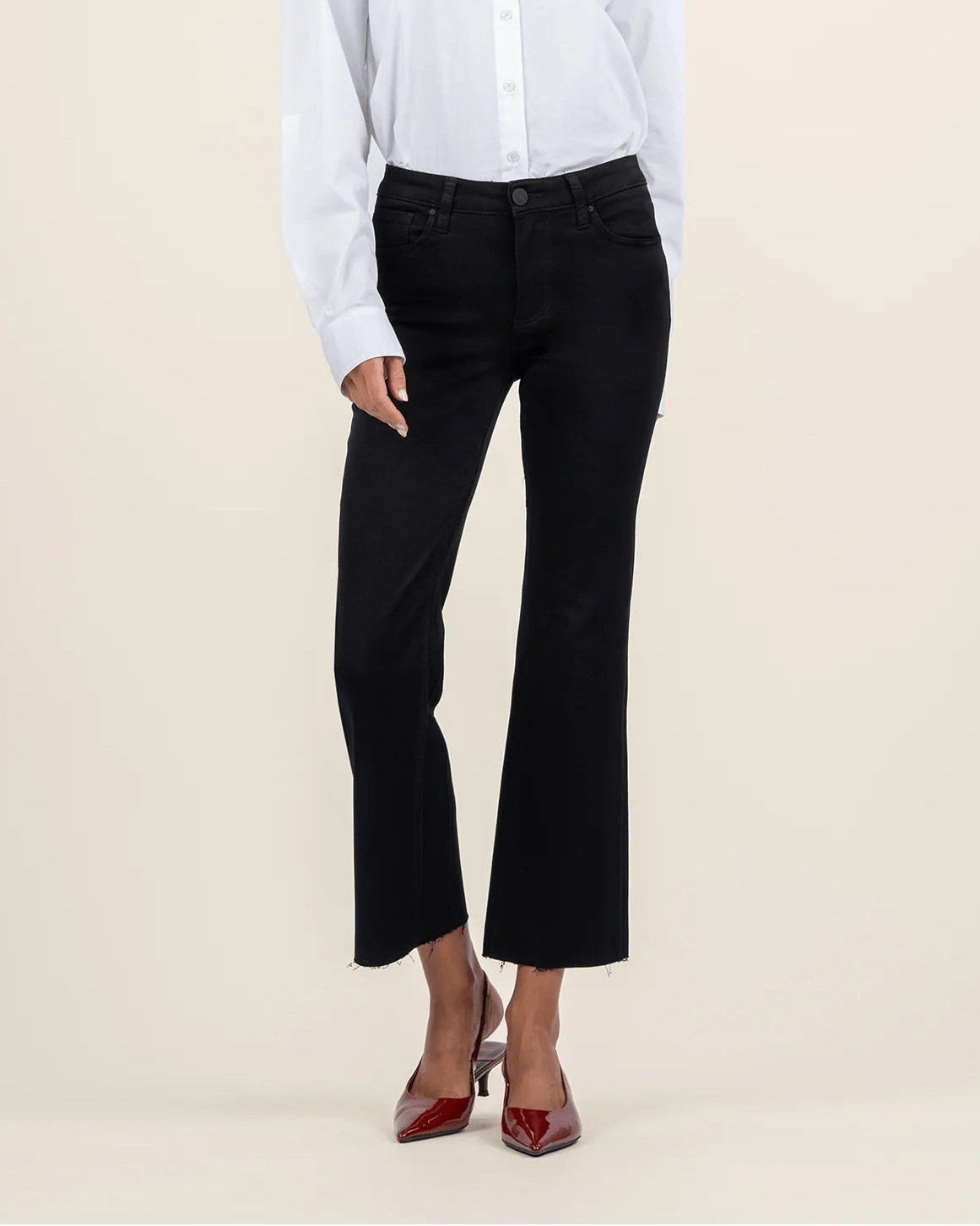 The Kelsey is super soft with a stretchy fabric and raw-cut hem. They are endlessly wearable jeans, designed with an inset leg and a kicky flared silhouette.