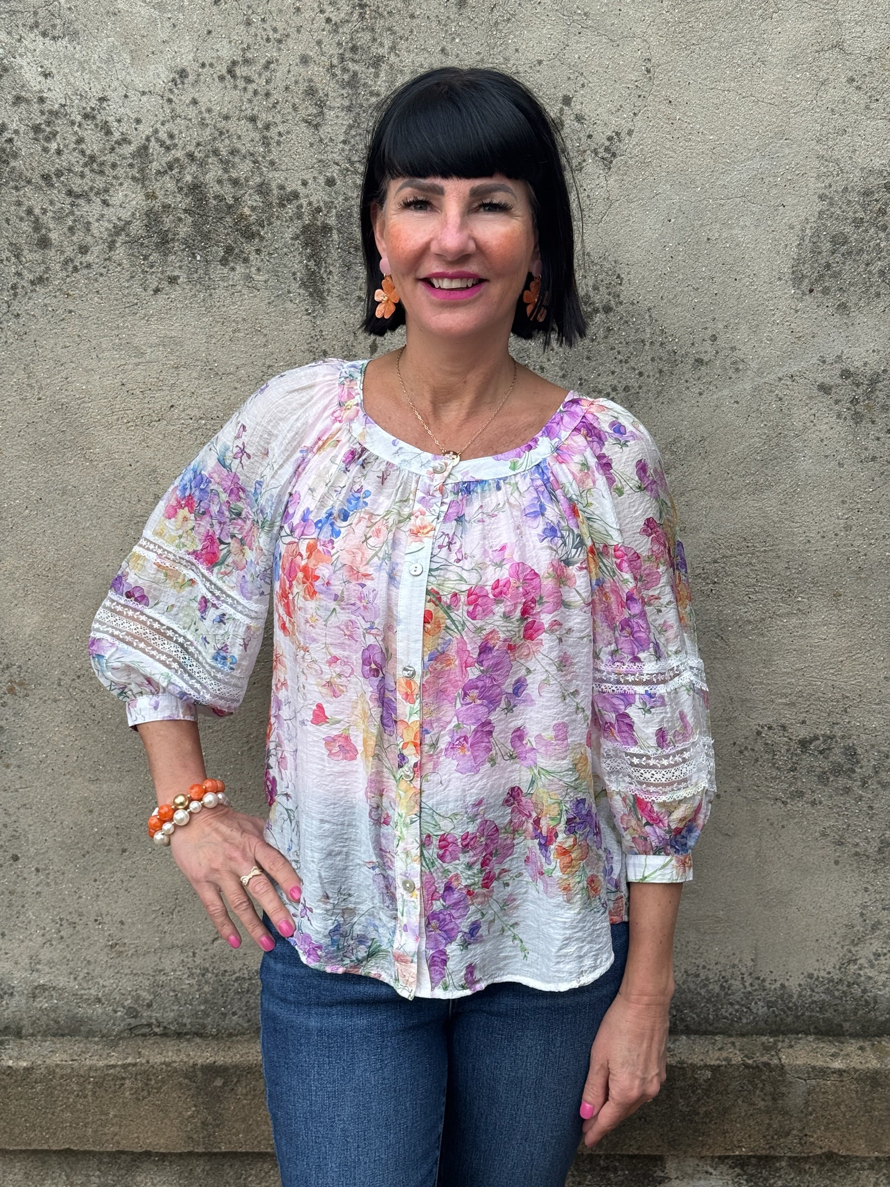Lila Lace-Detail Floral Puff Sleeve Blouse - White Multi