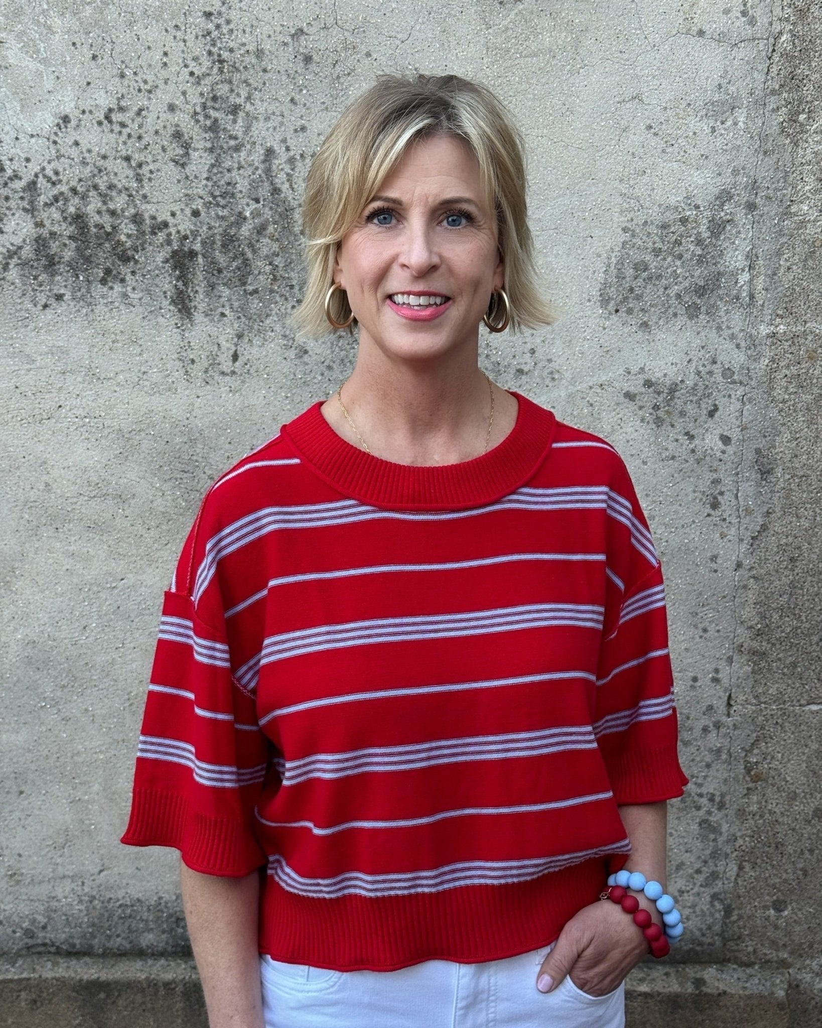 You’ll love how this lightweight knit feels on! Its poppy red and sky blue stripes offers a relaxed, friendly fit that pairs perfectly with your favorite blue or white denim. It’s the soft, breathable staple you have been waiting for.