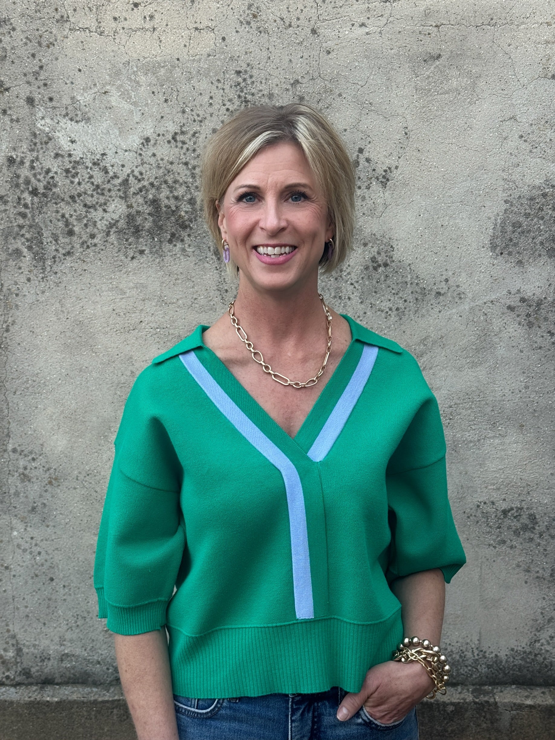 V Neck Collared Sweater with Front Stripe