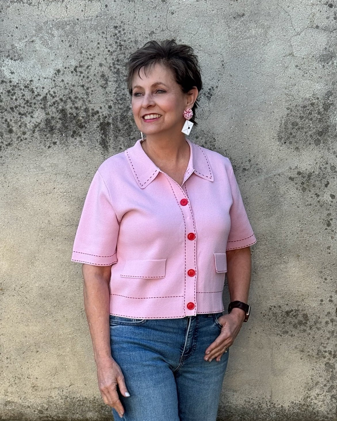Retro Stitched Button-Down – Pink & Red Contrast Tailored Top