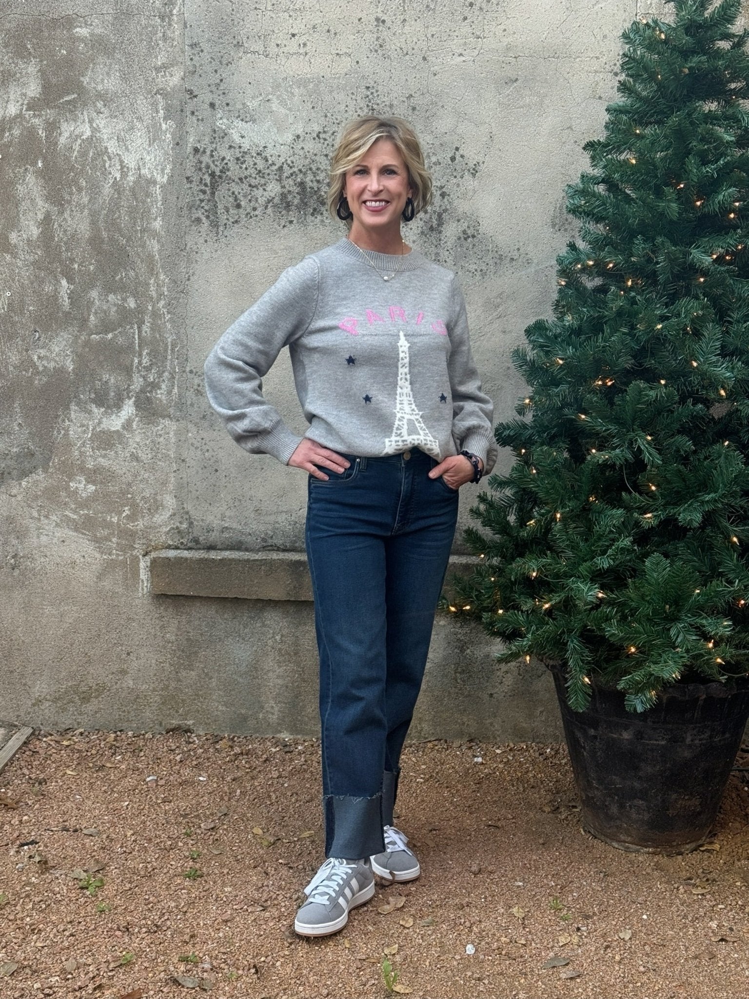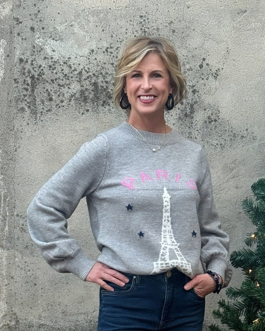 Crafted from a soft, cozy knit fabric, this sweater is designed for all-day comfort and warmth without sacrificing style. Its versatile grey hue makes it easy to pair with your favorite jeans, skirts, or trousers, while the relaxed fit ensures a flattering silhouette. Whether you're dreaming of a European getaway or simply adding a touch of romance to your everyday wardrobe, this sweater is the perfect choice for a chic, casual look.