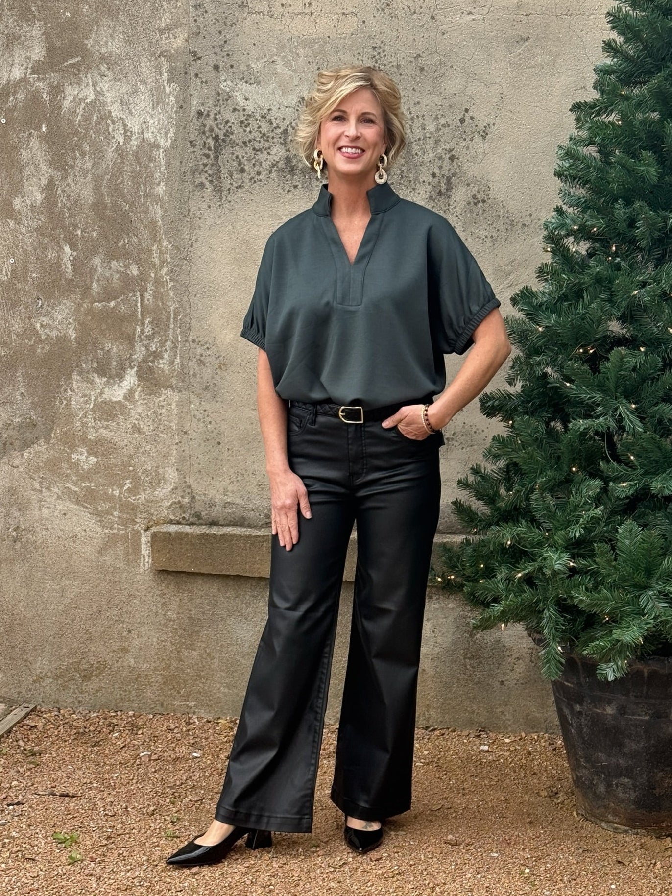 Elevate your wardrobe with our forest green v-neck dolman sleeve blouse, a perfect blend of sophisticated style and relaxed comfort. Crafted in a rich, deep forest green, this top offers a refreshing pop of color that effortlessly transitions from office elegance to evening chic. Its distinctive design ensures you'll stand out with understated grace, making it a versatile staple for any fashion-forward individual. This versatile blouse features a refined V-neckline complemented by a modern stand-up collar, creating an elegant silhouette that flatters every figure. The graceful dolman sleeves are finished with subtle gathered cuffs, adding a touch of tailored charm and a comfortable, unrestricted fit. Made from a smooth, luxurious fabric, it drapes beautifully, offering a polished look without compromising on ease.