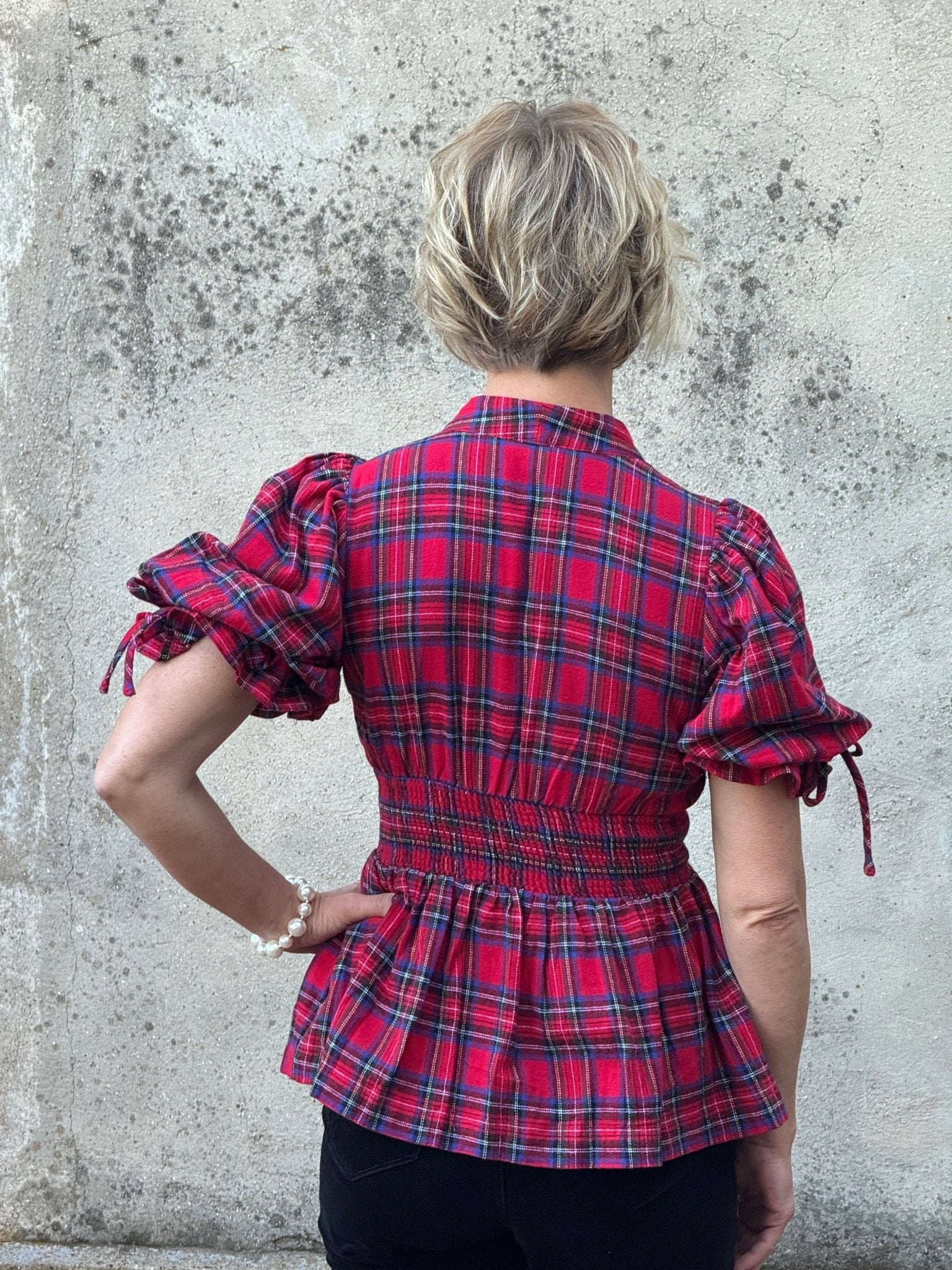 The top features a vibrant red plaid pattern, making it a perfect statement piece for any occasion. Designed to flatter, its unique construction offers both comfort and undeniable style, transitioning effortlessly from a casual day out to an elegant evening gathering.