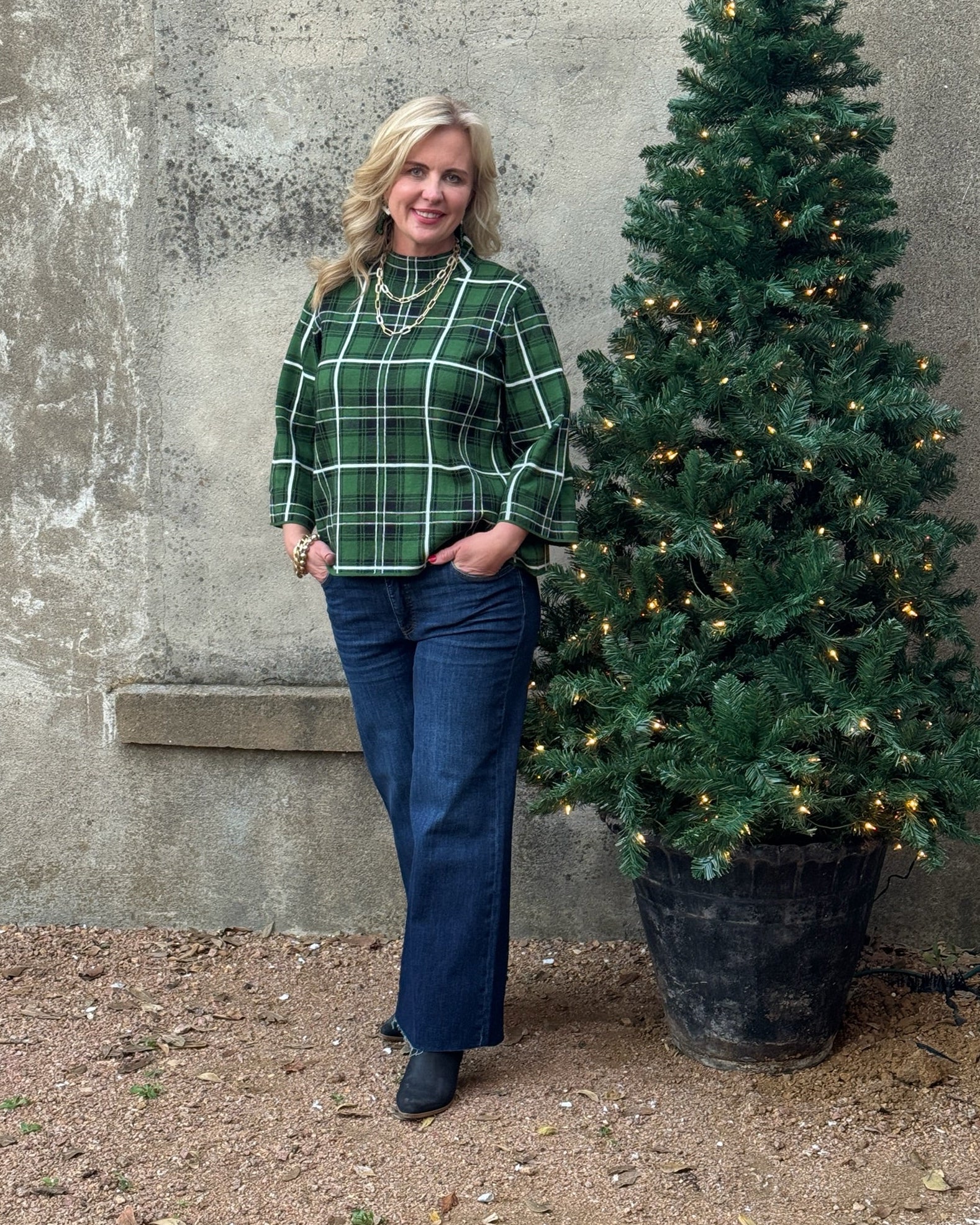 Embrace the season in style with this green plaid top. It's eye-catching piece features a vibrant green plaid pattern with contrasting black and white lines, offering a timeless yet contemporary look perfect for holiday gatherings or everyday elevated casual wear. The relaxed fit ensures maximum comfort without compromising on elegance, making it a wardrobe essential for fall and winter.