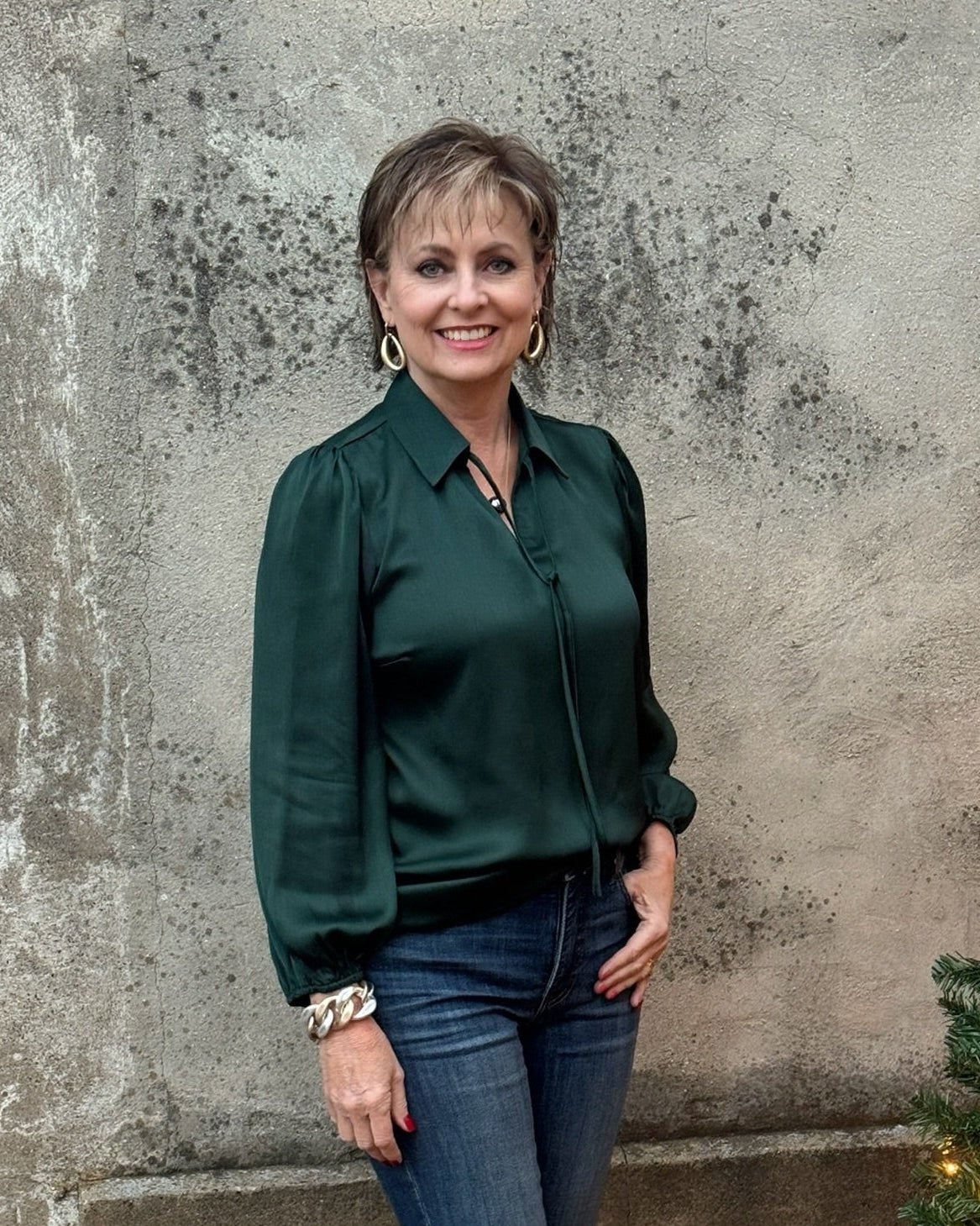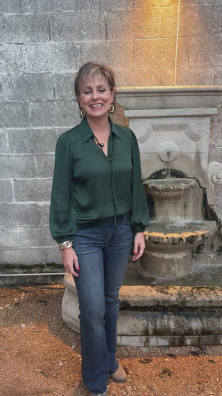 The rich jewel tone emerald green hue in this blouse provides a vibrant pop of color, perfect for adding a touch of elegance to any ensemble, making it an ideal choice for both professional settings and special occasions. This versatile top combines timeless design with modern appeal.