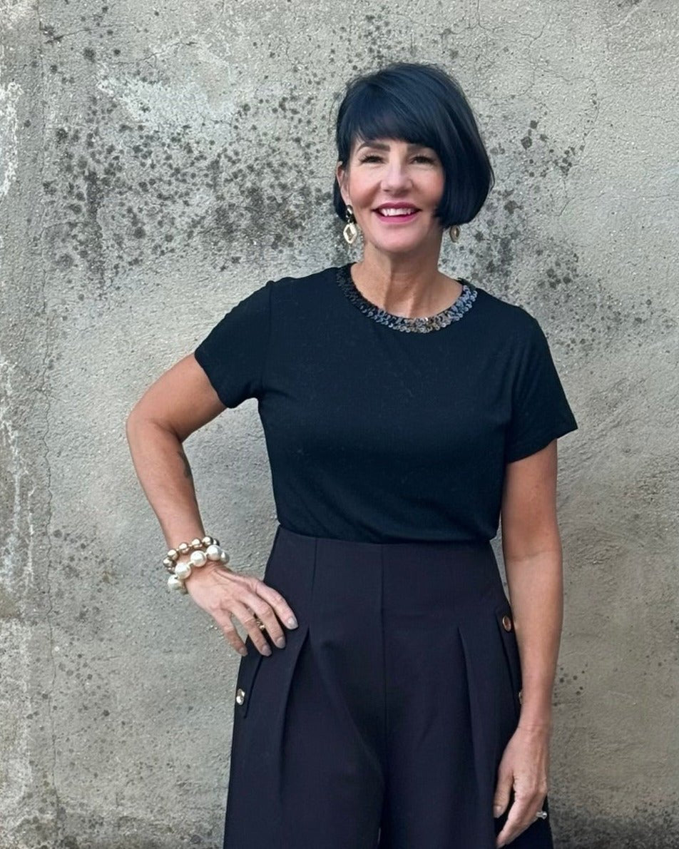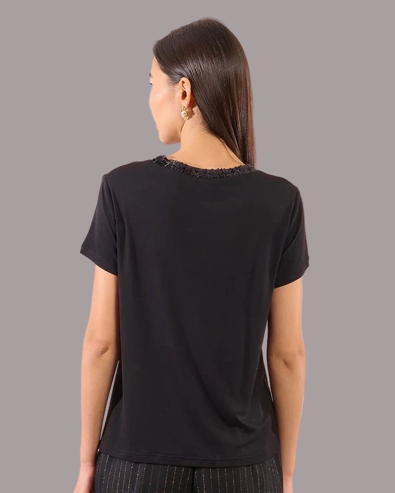 A classic tee with a sparkly twist. This straight-cut t-shirt features short sleeves and a round neckline trimmed with sequins for just the right amount of shimmer. At 23.6 inches in length, it hits at the perfect spot for tucking or wearing loose. It's a holiday essential!