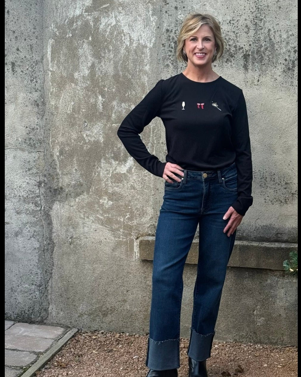 Ring in the New Year with unparalleled style and comfort in our festive black ribbed long-sleeve top. Designed to capture the spirit of celebration, this charming shirt features delicate embroidery of a sparkling champagne flute, cheerful 'New Year' balloons, and a dazzling sparkler, making it the perfect attire for your holiday festivities. Its versatile black hue ensures it pairs effortlessly with any bottom, from sleek skirts to your favorite denim.