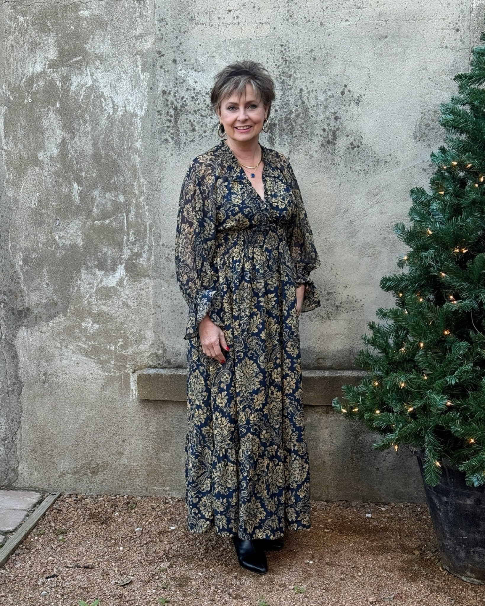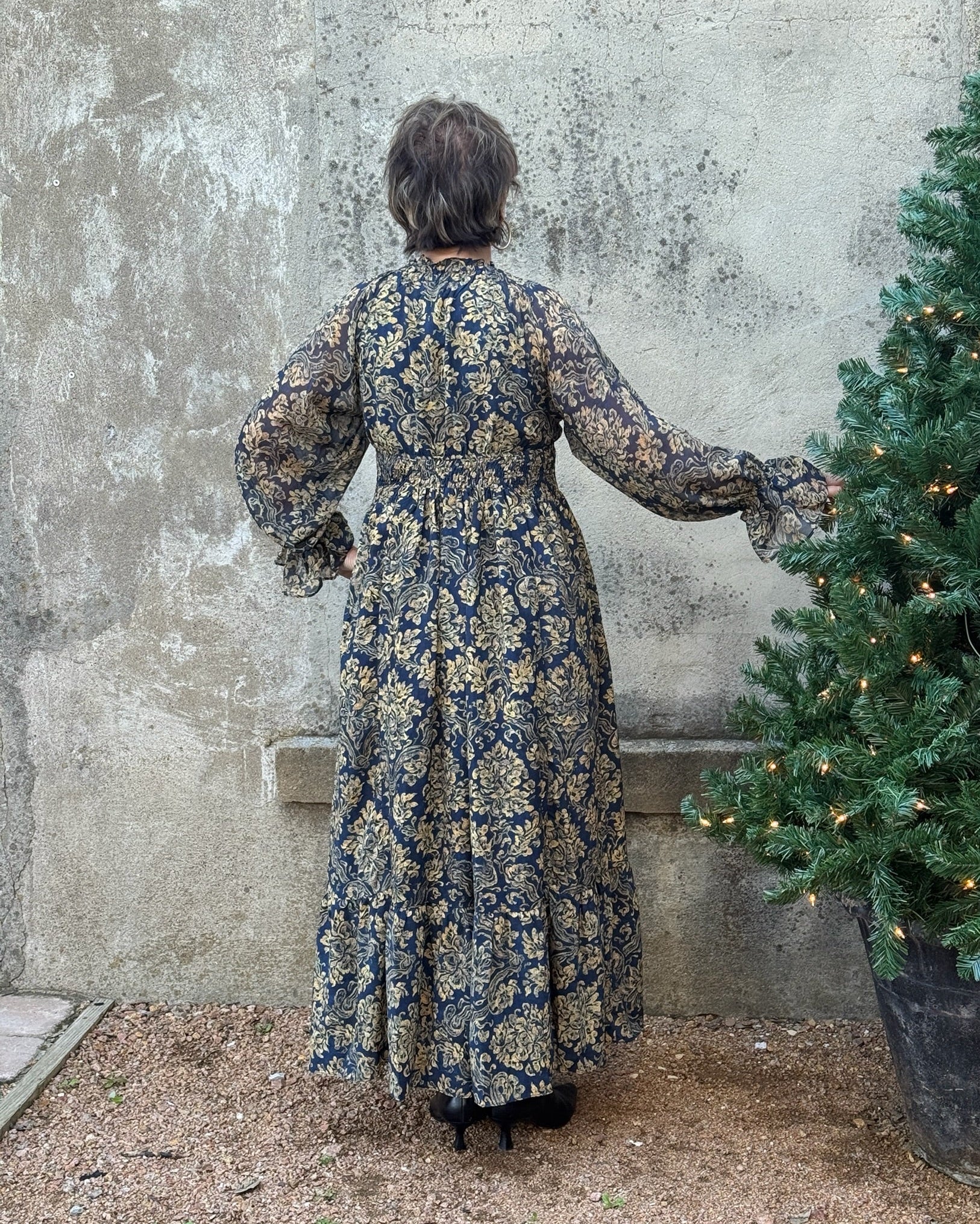 Embrace timeless elegance with our stunning floral paisley smocked maxi dress. This exquisite long-sleeve dress features a captivating navy background adorned with a rich gold paisley and floral print, creating a sophisticated and eye-catching design perfect for a variety of occasions.