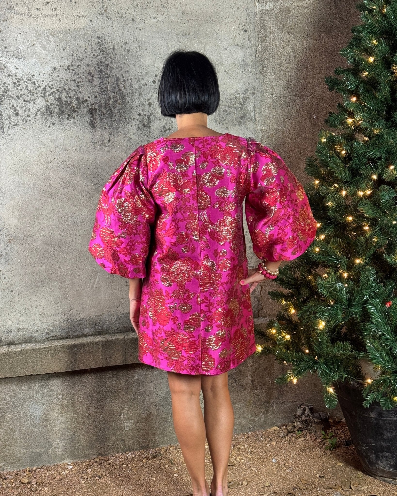 Step into the spotlight with our exquisite radiant fuchsia gold brocade dress. This stunning piece combines a vibrant fuchsia base with intricate gold floral brocade, creating a luxurious texture and an unforgettable visual appeal. Designed to make a statement, this dress ensures you'll turn heads at any festive occasion. Featuring elegantly voluminous puff sleeves and a chic V-neckline, this shift dress offers both sophisticated style and comfortable wearability. It's more than just a dress; it's a glam experience!