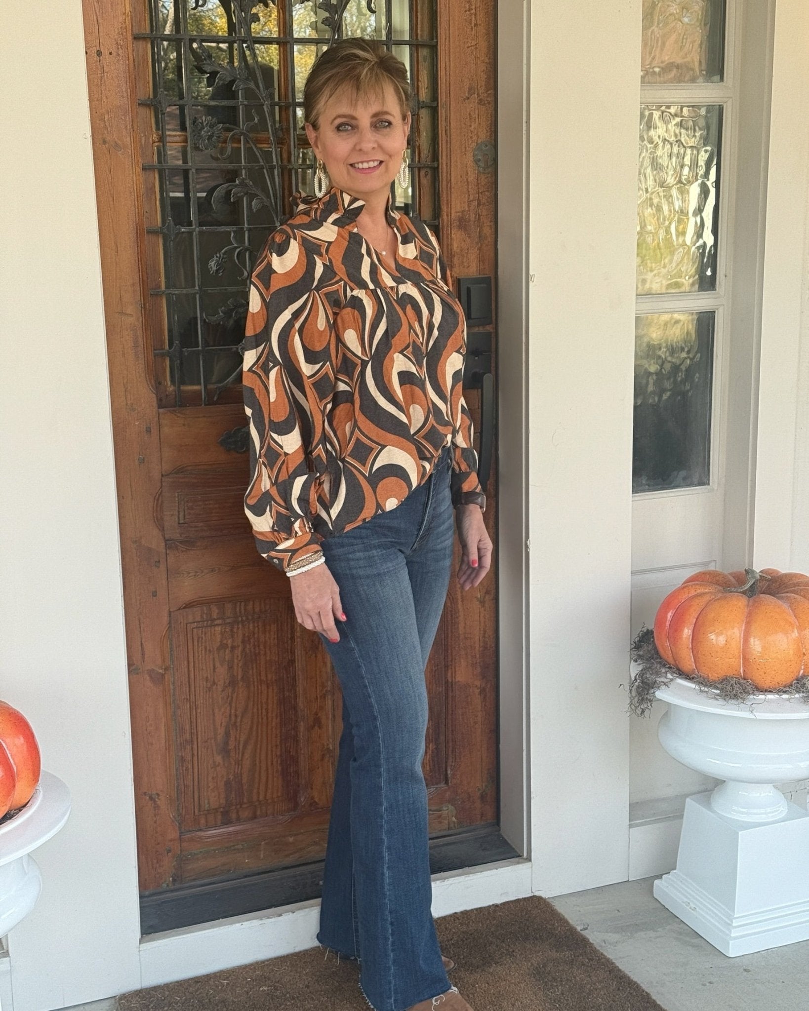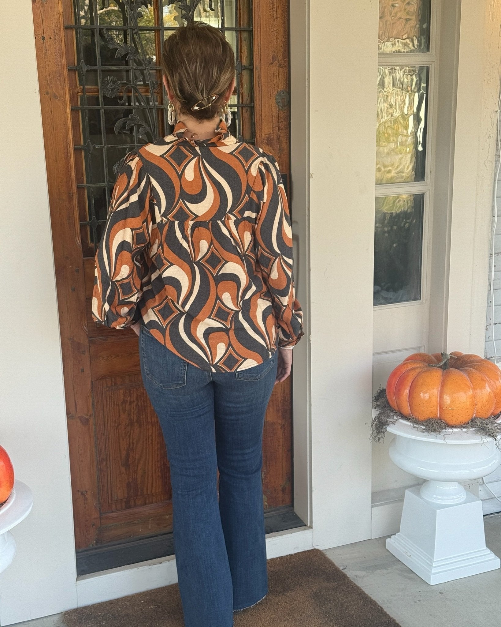 Step back in time with a modern twist in our enchanting Retro Swirl Print Long Sleeve Blouse. This captivating top features a vibrant abstract pattern in warm earthy tones of rust, black, and cream, designed to bring a touch of vintage flair to your contemporary wardrobe. Its unique, eye-catching design makes it a true statement piece, perfect for those who love to express their individual style with elegance.