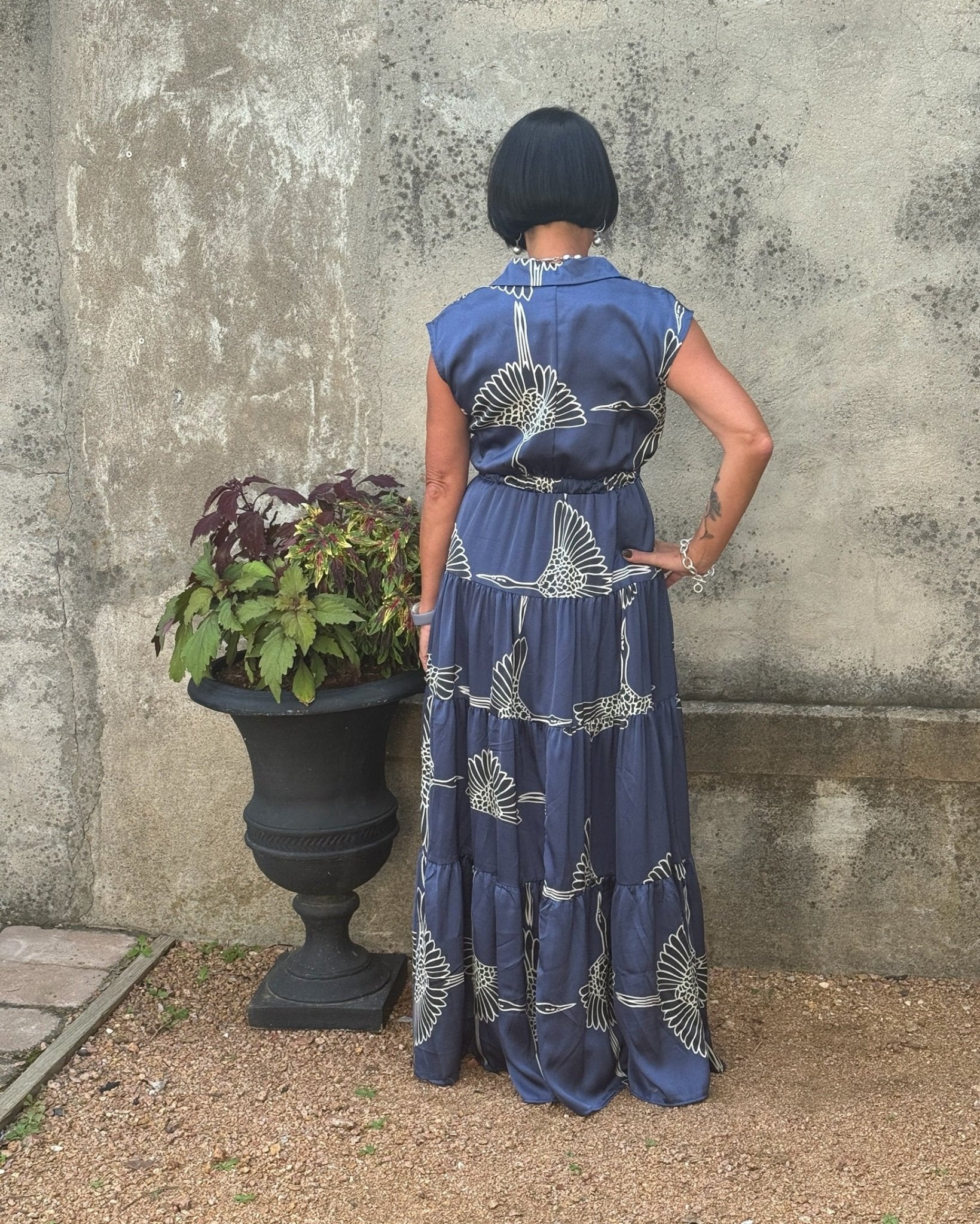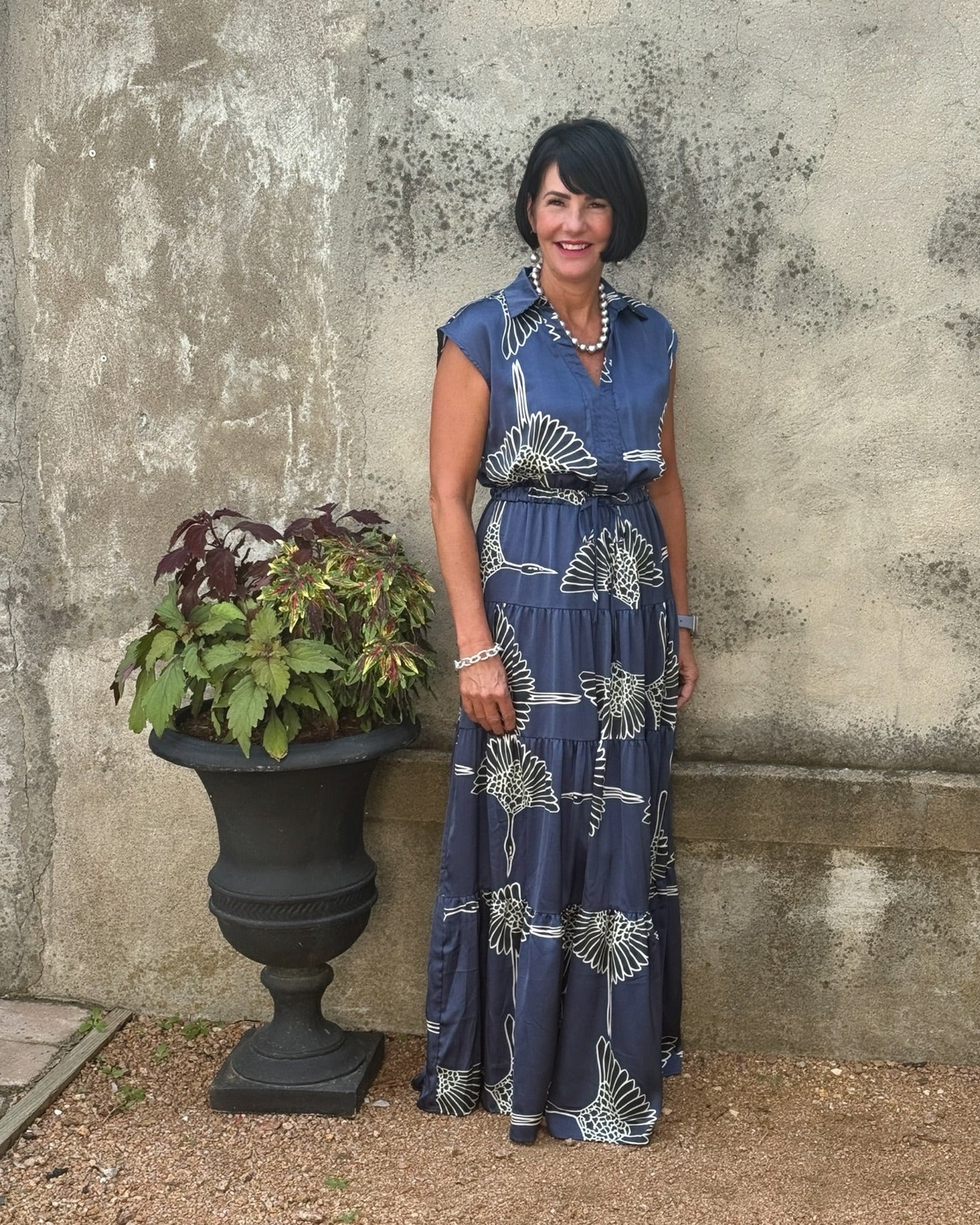 This blue and white tiered maxi dress by Pinch is year round elegance.  Wear it to a wedding, church or throw a cardigan or sweater over it when the weather cools down.