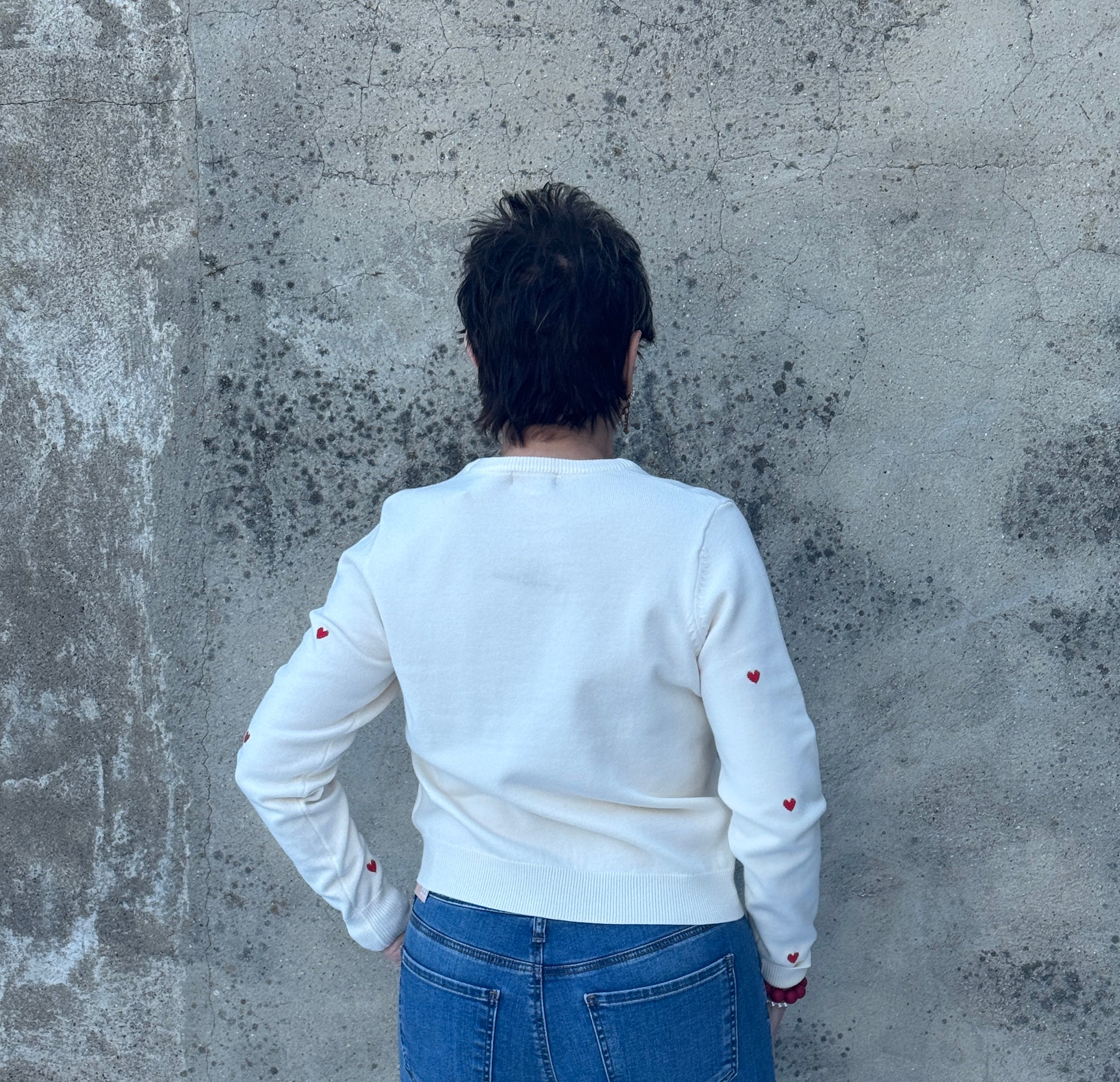 Elevate your everyday style with our sweetheart embroidered knit sweater. This charming off-white long sleeve pullover features delicate, vibrant red hearts scattered across a premium soft-touch fabric. Designed with a classic round neck and a flattering relaxed fit, it’s the ultimate "cozy-meets-chic" essential for everything from coffee dates to casual office days.