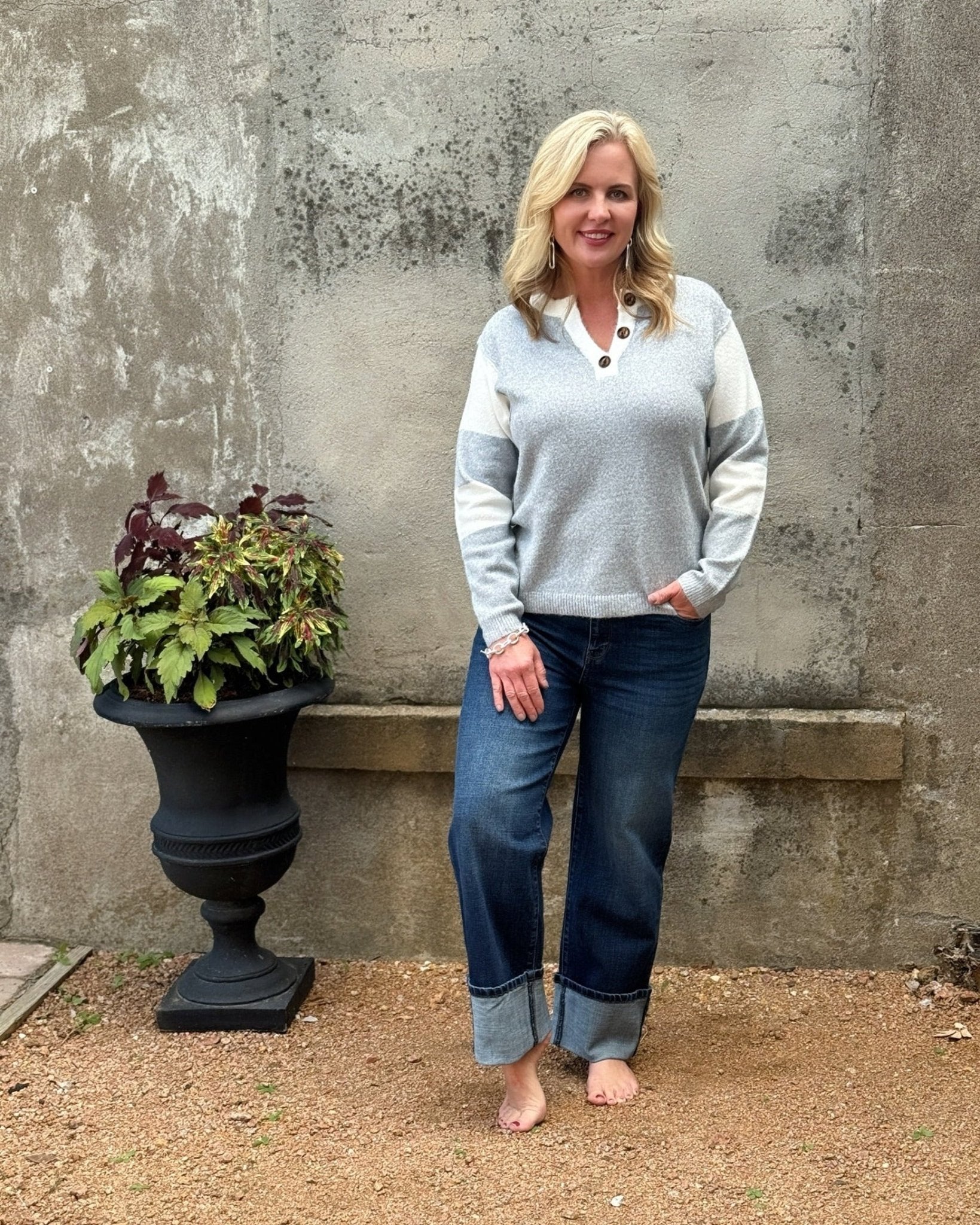 You'll love this easy to wear soft Henley color block sweater for out and about or lounging around.