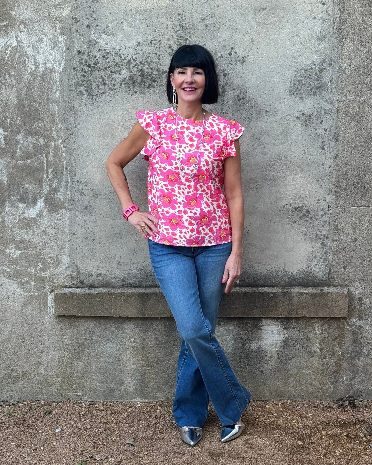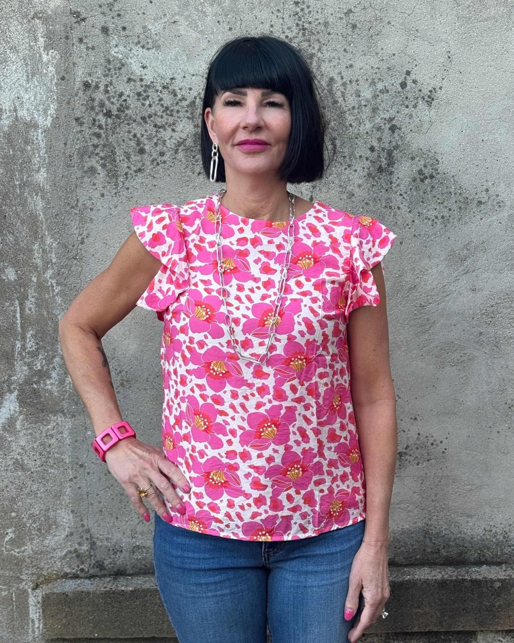 Pink Floral Cheetah Print Flutter Sleeve Top