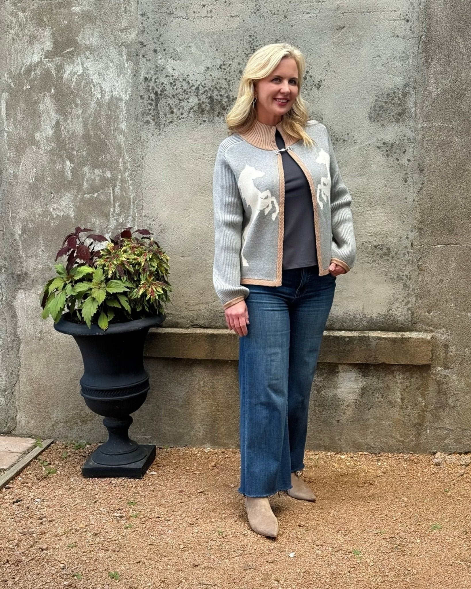 Stay cozy in this open sweater featuring a ribbed neck design and a rearing horse pattern. Its relaxed fit makes it easy to layer over your favorite outfits while adding a touch of rustic style. Perfect for casual days, cooler evenings and equestrian style!